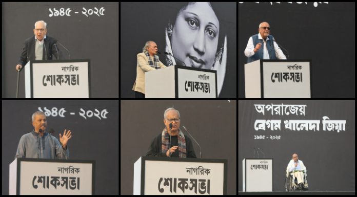 বাংলাদেশকে ভালো থাকতে হলে প্রয়াত বেগম খালেদা জিয়াকে হৃদয়ে ধারণ করতে হবে বলে মন্তব্য করেছেন দেশের নাগরিক সমাজ। খালেদা জিয়া একমাত্র নেত্রী যিনি মানুষের নেত্রী হয়ে উঠেছিলেন। তিনি কেবল একটি জাতীয়তাবাদী দলের নেত্রী ছিলেন না, তিনি সত্যিকার অর্থেই মানুষ ও দেশের নেত্রী হয়ে উঠেছিলেন। গতকাল শুক্রবার জাতীয় সংসদ ভবনের দক্ষিণ প্লাজায় অনুষ্ঠিত খালেদা জিয়ার স্মরণে নাগরিক শোকসভায় তারা এসব মন্তব্য করেন। স্মরণ সভায় বক্তৃতায় বেগম খালেদা জিয়ার একজন চিকিৎসক খালেদা জিয়ার চিকিৎসায় অবহেলা নিয়ে তদন্তের দাবি জানিয়ে বলেছেন,বেগম খালেদা জিয়ার চিকিৎসায় অবহেলা করে তাকে মৃত্যুর দিকে ঠেলে দেয়া হয়েছিল। তার চিকিৎসায় অবহেলার সমস্ত প্রমাণ আছে। ৩বারের সাবেক প্রধানমন্ত্রী বেগম খালেদা জিয়ার স্মরণে এই শোকসভা অনুষ্ঠিত হয়েছে।