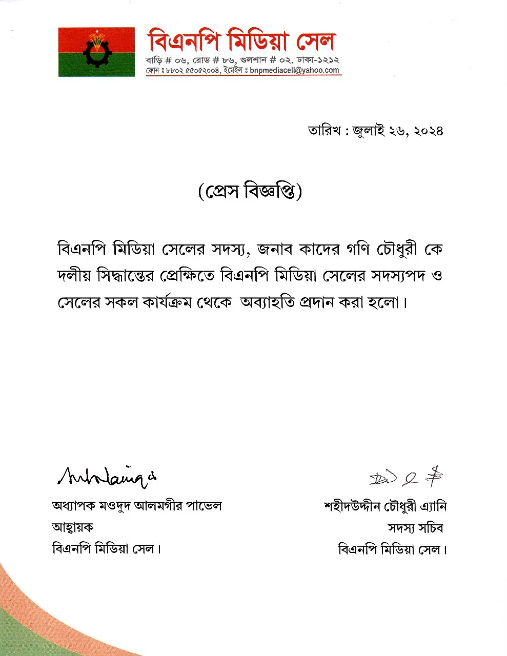 সোমবার রাতে বিএনপির মিডিয়া সেলের আহ্বায়ক অধ্যাপক মওদুদ আলমগীর ও সদস্যসচিব শহীদউদ্দিন চৌধুরী স্বাক্ষরিত বিজ্ঞপ্তিটি পাঠানো হয়। এতে বলা হয়, কাদের গণি চৌধুরীকে দলীয় সিদ্ধান্তের পরিপ্রেক্ষিতে বিএনপির মিডিয়া সেলের সদস্যপদ ও সেলের সব কার্যক্রম থেকে অব্যাহতি প্রদান করা হলো।
