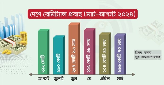 তবে শেখ হাসিনা সরকারের পদত্যাগের পর তা হু হু করে বাড়তে থাকে। এরই ধারাবাহিকতায় সদ্য বিদায়ী আগস্ট মাসে দেশে বৈধপথে রেমিট্যান্স এসেছে ২২২ কোটি (২ দশমিক ২২ বিলিয়ন) ডলার। দেশীয় মুদ্রায় (প্রতি ডলার ১২০ টাকা ধরে) যার পরিমাণ ২৬ হাজার ৬৪০ কোটি টাকার বেশি। রোববার (১ সেপ্টেম্বর) কেন্দ্রীয় ব্যাংকের সংশ্লিষ্ট বিভাগ সূত্রে এ তথ্য জানা গেছে।