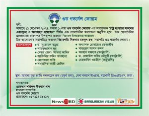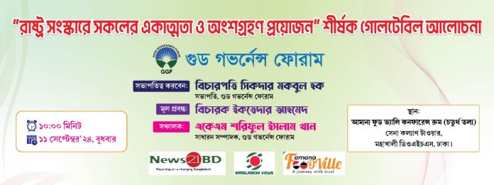 ঢাকাঃ আজ রাজধানীর মহাখালীর সেনা কল্যাণ টাওয়ার,আমানা ফুড ভ্যালী কনফারেন্স হলে সকাল ১০টায় ‘গুড গভর্নেন্স ফোরাম’ এর আয়োজনে নতুন বাংলাদেশ: “রাষ্ট্র সংস্কারে সকলের অংশগ্রহণ একাত্মতা ও অংশগ্রহন দরকার” শীর্ষক এক গোলটেবিল আলোচনা অনুষ্ঠিত হবে।