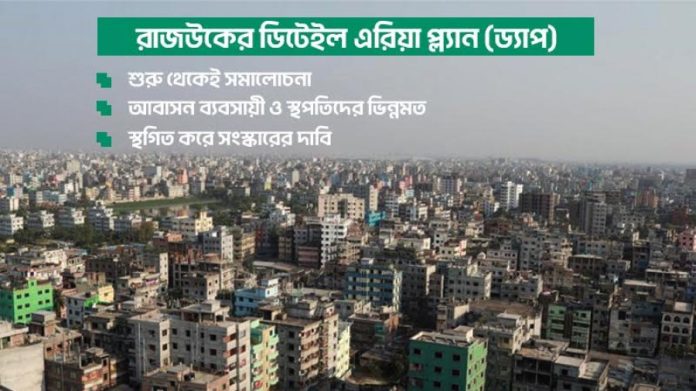 এদিকে রাজউকের মাস্টারপ্ল্যান ড্যাপকে ‘বৈষম্যমূলক’ আখ্যা দিয়েছে বাংলাদেশ স্থপতি ইনস্টিটিউট (বাস্থই)। একইসঙ্গে এই মাস্টারপ্ল্যান স্থগিত করে প্রয়োজনীয় সংস্কারের দাবি জানিয়েছে তারা। সংগঠনের সাধারণ সম্পাদক স্থপতি নবী নেওয়াজ খান বাংলা ট্রিবিউনকে বলেন, বিশদ অঞ্চল পরিকল্পনা (ড্যাপ) এর নতুন গ্যাজেট (২০২২-২০৩৫)বাস্তবায়ন স্থগিত করে আইনি এবং অন্যান্য অসঙ্গতি দূর করার জন্য সংশ্লিষ্ট অংশীজনদের সক্রিয় অংশগ্রহণ নিশ্চিত করতে হবে। একইসঙ্গে অবিলম্বে এই মাস্টারপ্ল্যান সংস্কারের জন্য প্রয়োজনীয় কার্যক্রম নিতে হবে।