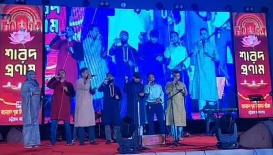 পূজা উদ্যাপন পরিষদ সূত্র বলছে, সন্ধ্যায় মঞ্চে নাচের অনুষ্ঠান হচ্ছিল। এ সময় কয়েকজন তরুণ এসে দেশাত্মবোধক গান পরিবেশন করবেন বলে মঞ্চে ওঠেন। তাঁরা দুটি গান পরিবেশন করেন। পরে তাঁরা ‘ধন্যবাদ’ দিয়ে নেমে চলে যান। তাঁরা গান গাওয়ার সময় কেউ তাঁদের নামায়নি বা প্রতিবাদ করেনি।