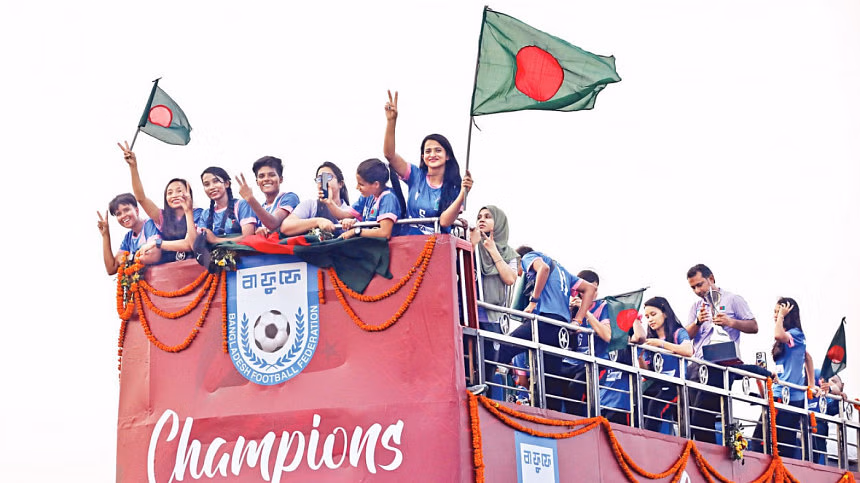 টানা দ্বিতীয়বারের মতো সাফ নারী চ্যাম্পিয়নশিপের শিরোপা জিতে বৃহস্পতিবার ট্রফি নিয়ে নেপাল থেকে দেশে ফেরার পর ছাদ-খোলা বাসে চড়ে বাংলাদেশ ফুটবল ফেডারেশনে (বাফুফে) পৌঁছায় মেয়েরা। সেখানে তারা সিক্ত হয় জমকালো সংবর্ধনায়।