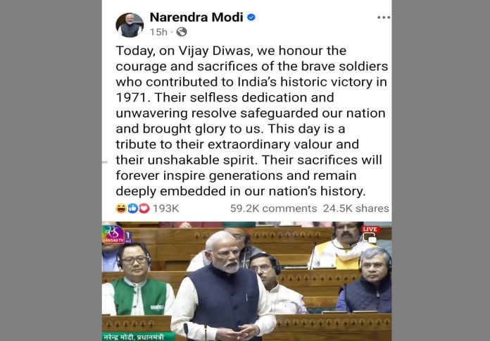 গতকাল (১৬ ডিসেম্বর ) মহান বিজয় দিবসে ভারতের প্রধানমন্ত্রী নরেন্দ্র মোদী যে পোস্ট করেছে। নরেন্দ্র মোদি ওই পোস্টে ১৯৭১ সালে পাকিস্তানি সেনাবাহিনীর আত্মসমর্পণকে ‘ভারতের ঐতিহাসিক বিজয়’ হিসেবে উল্লেখ করেছেন। বাংলাদেশের মানুষের মুক্তিযুদ্ধ নিয়ে কিছু বলেননি। বাস্তবচিত্র হচ্ছে ‘১৬ ডিসেম্বর, ১৯৭১ ছিল বাংলাদেশের বিজয়ের দিন। ভারত ছিল এই বিজয়ের মিত্র, এর বেশি কিছু নয়।’