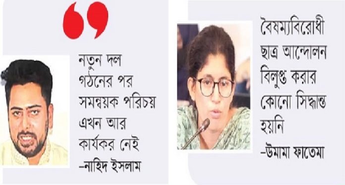 বৈষম্যবিরোধী ছাত্র আন্দোলনের অংশীদার ছাত্রদের সবাই নতুন রাজনৈতিক দল বা নতুন ছাত্র সংগঠনে যুক্ত হয়নি। অংশীদারদের আলোচনা ছাড়া প্ল্যাটফর্ম বিলুপ্ত হবে না। তাই বিভ্রান্ত না হওয়ার অনুরোধ রইল।