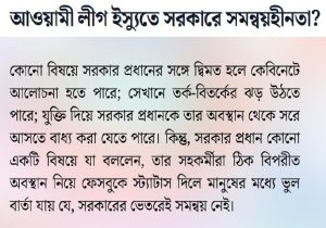 কোনো বিষয়ে সরকার প্রধানের সঙ্গে দ্বিমত হলে কেবিনেটে আলোচনা হতে পারে; সেখানে তর্ক-বিতর্কের ঝড় উঠতে পারে; যুক্তি দিয়ে সরকার প্রধানকে তার অবস্থান থেকে সরে আসতে বাধ্য করা যেতে পারে। কিন্তু, সরকার প্রধান কোনো একটি বিষয়ে যা বললেন, তার সহকর্মীরা ঠিক বিপরীত অবস্থান নিয়ে ফেসবুকে স্ট্যাটাস দিলে মানুষের মধ্যে ভুল বার্তা যায় যে, সরকারের ভেতরেই সমন্বয় নেই।