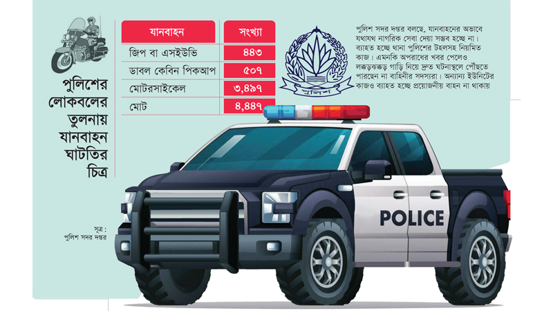 পুলিশ সদর দপ্তরের হিসাব অনুযায়ী, বর্তমানে বাহিনীতে ৪ হাজার ৪৪৭টি যানবাহনের ঘাটতি রয়েছে। এর মধ্যে সবচেয়ে বেশি ৩ হাজার ৪৯৭টি মোটরসাইকেলের ঘাটতি। জেলা ও উপজেলা পর্যায়ে পুলিশের প্যাট্রোল ডিউটিতে সবচেয়ে বেশি ব্যবহার হয় এ বাহনটিই। ঘাটতি রয়েছে ডাবল কেবিন পিকআপেরও, যা দিয়ে টহল কার্যক্রমের পাশাপাশি বিভিন্ন ধরনের জরুরি অভিযান পরিচালনা করা হয়। এ ধরনের গাড়ির সংকট মোট ৫০৭টি।