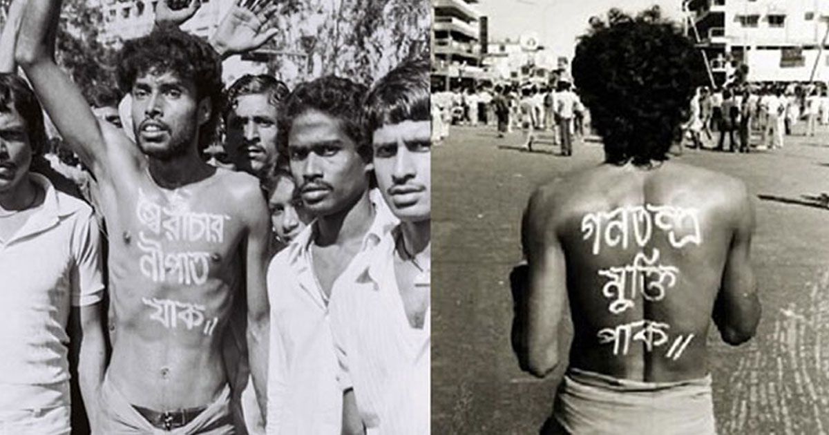 “এটা আমি করেছিলাম, একটা উদ্দেশ্য মাথায় রেখে। যেহেতু নূর হোসেন বলেছিল আরও একশো জনের গায়ে শ্লোগান লেখা থাকবে, তার মধ্যে আমার লেখা শ্লোগান যেন আলাদা করে চেনা যায়। কিন্তু নূর হোসেন আমাকে আসলে মিথ্যে কথা বলেছিল। সে একাই আসলে সেদিন এভাবে রাস্তায় নেমেছিল। আর কেউ গায়ে শ্লোগান লিখে রাস্তায় নামেনি সেইদিন।”
