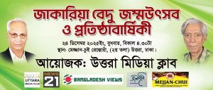 এই উপলক্ষে আজ ২৪ ডিসেম্বর, বুধবার, সন্ধ্যা ৫.৩০টায় উত্তরার গাউসুল আজম জনপদের মেজবান রেস্টুরেন্টে কবি জাকারিয়া চৌধুরী -আমিনুল ইসলাম বেদু জন্মোৎসব ও ক্লাবের ১৩ তম প্রতিষ্ঠা বার্ষিকী জমকালো অনুষ্ঠানের মাধ্যমে উদযাপিত হয়েছে।